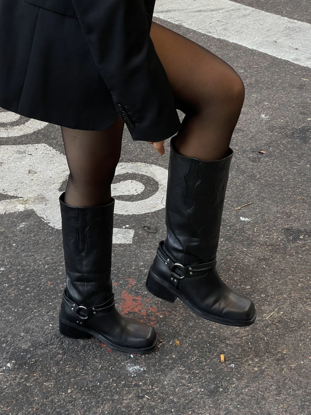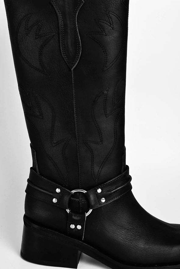 bordado en todo el largo de la caña con hilo a tono más estribo con herrajes matalicos